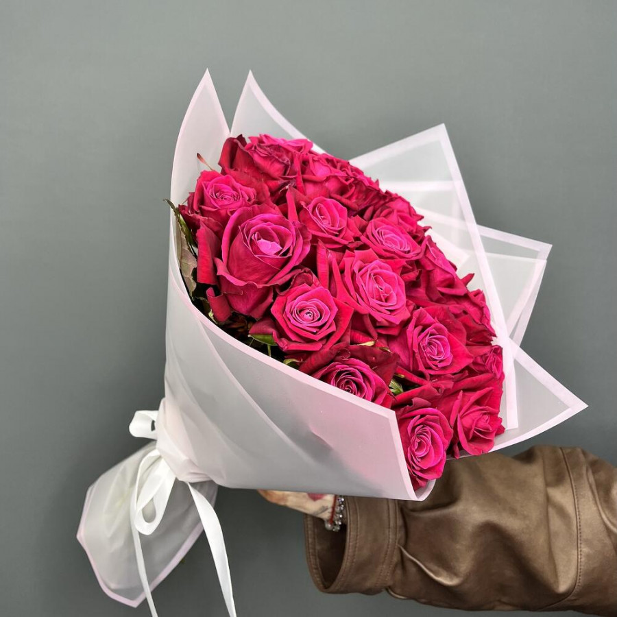 На фото букет из 21 малиновой розы. В составе: роза 21 шт, дизайнерская упаковка 2 шт, атласная лента 1 шт, . Все цветы свежие и ароматные, букет красиво оформлен и отлично подходит для подарка. Доступна доставка цветов или самовывоз.
